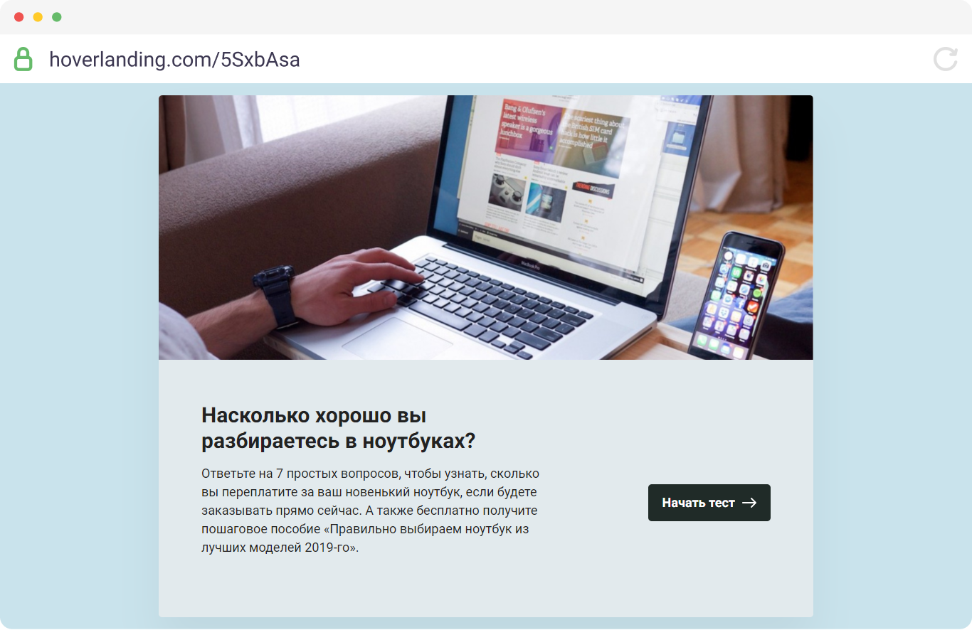 Пройдя тест на этом квиз-лендинге, посетитель узнает, сколько он переплатит за новый ноутбук, если будете заказывать его прямо сейчас. Также он оставит контактные данные.
