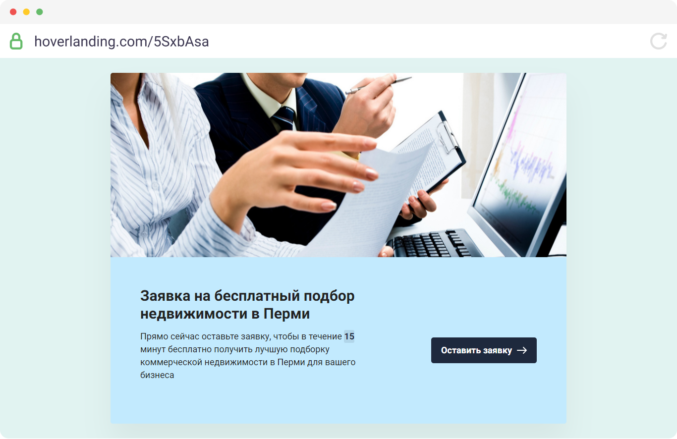 Квиз-лендинг для сбора заявок на бесплатное получение подборки коммерческой недвижимости для бизнеса в вашем городе