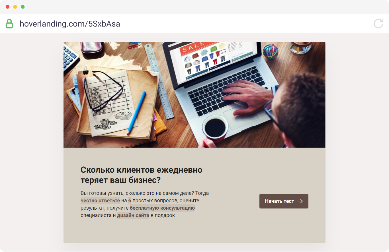 Пройдя тест на квиз-лендинге, посетители узнают, сколько клиентов теряет их бизнес ежедневно, получат приглашение на бесплатную консультацию и дизайн сайта в подарок